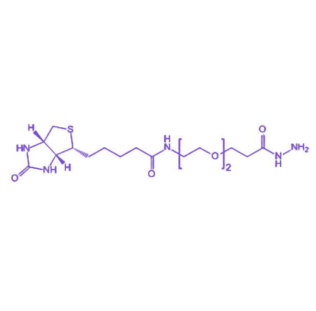 Biotin-PEG2-HZ 是一种由生物素(Biotin)、双聚乙二醇链(PEG2)和肼基(Hydrazide,HZ)构成的功能化分子,主要用于对含醛基或酮基的目标分子进行特异性标记,通过生物素-链霉亲和素/亲和素体系实现后续的捕获、分离或检测。其核心设计在于三部分结构的协同作用:生物素端可与链霉亲和素或亲和素形成超高亲和力复合物,为信号放大或分子固定提供特异性结合位点;PEG2 链段能显著提升分子在水相体系中的溶解性,并通过增加空间柔性减少标记反应中的位阻效应;肼基(HZ)端作为关键反应基团,可在温和条件下与醛基/酮基发生特异性缩合反应,形成稳定的腙键,确保生物素标签高效且稳定地引入目标分子或表面。 该分子适用于蛋白质、核酸、纳米材料及芯片表面等体系的生物素化修饰,尤其针对含有醛基或酮基的分子体系,如氧化后的多糖、醛基修饰的纳米颗粒及芯片表面。通过生物素-链霉亲和素的高特异性相互作用,可广泛应用于分子固定、信号放大及高灵敏度检测等场景,在免疫分析、分子诊断、生物传感器构建和生物成像等领域具有重要应用价值。