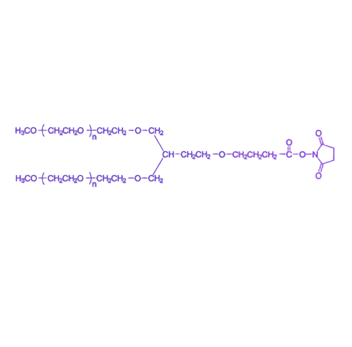 2-Arm PEG-SBA是一种以琥珀酰丁酸活性酯(SBA)为末端的双臂结构聚乙二醇衍生物,分子呈对称Y型,由中心连接基团分叉出两条等长PEG链,每条末端带有一个活性NHS-丁酸酯基团。该活性端基可与含氨基分子(如蛋白质、肽、聚合物等)快速反应形成稳定酰胺键,双臂结构设计实现双点偶联,兼顾高反应效率与分子对称性,适用于蛋白质PEG化、药物载体构建、组织工程水凝胶制备及表面抗污修饰等领域,能有效提升生物分子稳定性与溶解度,延长体内循环时间并减少免疫识别。 分子结构呈对称Y型拓扑结构,以中心连接基团为支点分叉形成两条等长线性PEG链,每条链末端共价连接一个SBA活性酯基团,通过双位点设计实现与生物分子的多点共价结合,相较于单臂PEG衍生物具有更高的偶联效率和结构稳定性。 SBA端基作为NHS类活性酯的一种,在pH 7.5~8.5的温和条件下可与伯胺或仲胺发生高效酰胺化反应,反应速率适中,能避免对生物分子活性结构的破坏。与传统NHS酯相比,其在有机溶剂中的溶解性更优,反应过程可控性更强,生成的酰胺键具有更高的水解稳定性,可在生理环境下长期保持共价连接。 产品为白色或类白色粉末状固体,易溶于DMSO、DMF等极性有机溶剂,部分分子量规格可分散于中性缓冲液体系。由于SBA活性酯对湿气和高温敏感,储存需满足避光、干燥、-20°C冷冻条件,建议使用前进行真空干燥处理以去除残留水分。 在生物偶联领域,通过与蛋白质表面赖氨酸残基的ε-氨基反应,可实现PEG链的定点修饰,降低生物分子的免疫原性并提高其在体内的代谢稳定性;在药物载体构建中,可作为交联剂实现纳米颗粒的表面功能化或水凝胶网络的交联固化;在材料表面修饰中,通过与氨基化基底反应形成PEG刷状涂层,赋予材料优异的抗非特异性蛋白吸附性能。 产品提供多种分子量规格选择,范围覆盖1kDa至40kDa,批次间分子量分布系数(PDI)控制在1.05以内,端基活性率≥90%,可根据用户需求定制特定分子量或特殊官能团修饰的衍生物,满足不同场景下的偶联需求。