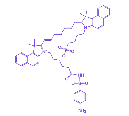 ICG-sulfanilamide 是通过特定化学方法将吲哚菁绿(ICG)与磺胺连接形成的生物活性分子,兼具近红外荧光示踪功能与生物靶向作用,在生物医学领域具有潜在的疾病诊断与治疗监测应用价值。 该分子的核心构成单元赋予其双重功能特性:吲哚菁绿作为近红外荧光染料,具有特定光学特性,其最大吸收波长约为785nm,发射波长约为820nm,此光学窗口可穿透生物体内深层组织,实现高对比度荧光成像;磺胺则提供生物活性基础,其磺酰胺基结构能够与生物体内多种酶、蛋白等靶点发生特异性相互作用。 在生理环境中,ICG-sulfanilamide 表现出良好的稳定性,可通过吲哚菁绿组分的荧光信号实时追踪其在生物体内的动态分布与代谢过程,同时磺胺结构单元可介导与生物靶点的识别及结合,为疾病的精准诊断和治疗效果评估提供一体化解决方案。