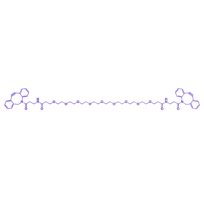 两个 DBCO 基团赋予该试剂无铜点击反应的核心优势,可在生理温度(37℃)、中性 pH(7.0-8.5)条件下,通过环张力促进的炔-叠氮环加成反应(SPAAC)与叠氮化物快速形成稳定三唑键,无需铜催化剂,有效避免金属离子对生物分子活性的破坏。九聚乙二醇(PEG9)链作为连接臂,不仅继承了 PEG 的亲水性与生物相容性,更以约 2.9nm 的链长提供充足空间距离与高柔性,既能适配中远距离双靶点偶联,又可避免过长链导致的构象紊乱,完美平衡空间位阻与连接稳定性。相比短链同类物(如 PEG6、PEG8),DBCO-PEG9-DBCO 的额外乙二醇单元进一步增强了水溶性与链段柔性,在疏松材料修饰、PROTAC 中长链连接桥、纳米载体长效循环优化等场景中优势显著。