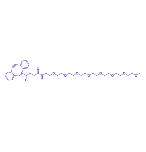 核心结构由三部分构成:甲氧基封端基团提供分子末端稳定性,八聚乙二醇(PEG8)链段作为连接骨架,二苯并环辛炔(DBCO)作为活性反应基团,共同形成兼具水溶性与反应活性的分子架构。相较于短链PEG衍生物,PEG8链段的更长碳链显著提升水溶性与生物相容性,有效削弱生物分子间的非特异性吸附,增强偶联产物的体内稳定性,在修饰生物分子时可减少对活性位点的空间阻碍,在纳米材料改性中能构建更易穿透生物屏障的功能化表面。