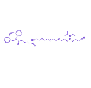 DBCO-TEG Phosphoramidite是一种融合高反应活性与核酸修饰适配性的特种磷酰胺化合物,其分子结构包含双环辛炔(DBCO)基团与三乙二醇(TEG)柔性连接链,主要用于在寡核苷酸(DNA/RNA)的3’端或5’端引入DBCO官能团,便于后续与叠氮修饰的生物分子或材料进行特异性共价连接,广泛应用于核酸探针、药物及生物传感器等领域的构建。