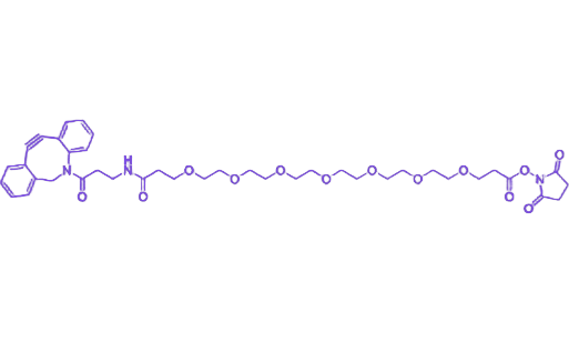 DBCO 基团具备无铜点击化学特性,无需铜催化剂即可与叠氮基在温和条件下发生高效、特异性环加成反应,有效避免金属离子对生物样本的潜在毒性,特别适用于活体生物分子标记、细胞内信号传导研究等对实验条件敏感的场景。氨基修饰为分子提供了多样化的化学反应位点,可通过胺基参与的缩合、取代等反应拓展功能化修饰途径。PEG7 链段相较于短链 PEG 具有更优异的亲水性和分子柔韧性,能显著降低非特异性吸附,提升生物相容性,延长偶联物在体内的循环时间并增强化学稳定性。NHS 酯基团在中性至弱碱性环境中可快速与含游离氨基的生物分子(如蛋白质、多肽、抗体等)发生酰胺化反应,形成稳定的共价偶联键,实现靶向分子的高效修饰。