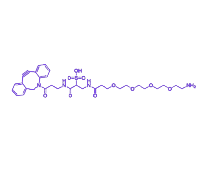 其核心结构特征表现为:Sulfo DBCO环具有应变炔烃结构,可在无铜催化条件下与叠氮基团(–N₃)发生快速、高选择性的[3+2]环加成反应(SPAAC),实现温和的生物正交偶联;PEG4链提供柔性缓冲空间与优异水溶性,有效降低分子间空间位阻,提升偶联效率与整体稳定性;末端伯胺(–NH₂)作为反应位点,可进一步参与NHS酯、羧基或醛类化学反应,支持二次功能化或药物偶联设计。