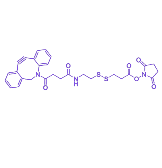 该化合物通过应变促进叠氮-炔环加成反应(SPAAC)实现无金属催化的生物正交连接,同时NHS酯基团可快速与伯胺(–NH₂)发生酰化反应,生成稳定的酰胺键,从而实现对含胺分子与叠氮修饰底物的双端共价偶联。二硫键(–SS–)赋予偶联体系可控可逆性,在还原环境(如谷胱甘肽或DTT存在条件下)可发生断裂,适用于构建可解离的动态偶联系统。