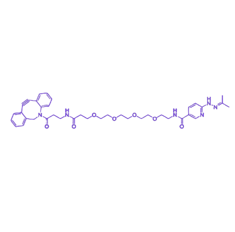 HyNic-PEG4-NH2-DBCO是一种双反应端基功能化聚乙二醇衍生物,其分子设计整合了芳香肼(HyNic)与二苯并环辛炔(DBCO)基团,通过四单元乙二醇链段(PEG4)实现空间分隔与柔性连接,适用于生物分子的高效双功能交联。该化合物兼具生物相容性与高反应活性,可在温和条件下实现双通道生物正交标记,是构建杂合生物探针、药物递送体系及生物传感界面的关键工具。