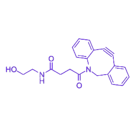 分子结构中,羟基(-OH)可通过酯化、醚化等反应与含羧基、卤代基的生物分子(如小分子药物、短肽、荧光染料)形成稳定共价键,实现定向修饰;DBCO 基团 能通过 无铜点击化学(SPAAC 反应) 与叠氮修饰分子快速反应,在温和条件下形成稳定三唑键,避免金属催化剂残留对生物体系的干扰;C2 短碳链(仅 2 个碳原子)作为间隔臂,空间体积极小,可最大限度减少对靶分子活性位点的空间遮挡,尤其适配小分子药物、酶活性中心等空间受限场景的修饰需求。