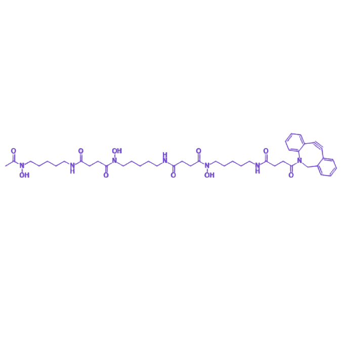 Deferoxamine-DBCO是一种将去铁胺与二苯并环辛炔(DBCO)进行分子融合的功能性化合物,兼具铁离子螯合调节与生物偶联反应活性双重核心功能,为化学合成、生物医学研究及相关领域提供高效工具分子。 铁螯合能力由去铁胺结构单元实现,作为天然铁螯合剂可选择性结合Fe³⁺,以1:1化学计量比形成稳定铁胺复合物,通过调控生物体内游离铁离子浓度维持铁代谢平衡。该特性使其在铁过载相关疾病研究、金属离子调控实验中具有应用潜力。 点击化学反应特性依托DBCO基团的高反应活性,通过应变促进的环加成反应(SPAAC)与含叠氮基团的分子实现快速、特异性偶联。反应体系无需催化剂参与,具有选择性高(无副反应干扰)、动力学速率快(秒级至分钟级完成)、产物产率优异等特点,适用于活细胞标记、药物递送系统构建、生物分子功能化修饰等场景。