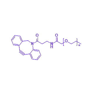 PEG-DBCO(聚乙二醇-二苯并环辛炔)是一类整合亲水性聚乙二醇(PEG)链与疏水性二苯并环辛炔(DBCO)基团的生物共轭功能化试剂,其核心价值在于通过无铜点击化学(SPAAC) 机制实现与叠氮化物(Azide)的高效特异性偶联,为生物分子修饰及药物递送系统构建提供温和且可控的反应平台。 该试剂分子结构中,DBCO基团作为反应活性中心,可在无催化剂条件下与叠氮化合物发生[3+2]环加成反应,具有反应速率快、选择性高、生物相容性优异等特点,尤其适用于蛋白质、抗体、核酸等敏感生物分子的位点特异性修饰。PEG链的引入则显著提升了整体分子的水溶性和体内循环稳定性,同时通过空间位阻效应减少非特异性结合,降低免疫原性风险。 在应用场景中,PEG-DBCO凭借其独特的化学特性,广泛服务于生物成像探针标记、纳米材料表面功能化及靶向药物载体构建等前沿领域。通过对生物分子的精准修饰,可实现药物递送系统的靶向性优化、生物分析方法的灵敏度提升,以及纳米载体的多功能化改造,为生物医药研究及临床转化提供关键工具支持。