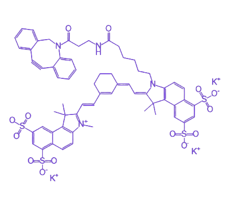 Sulfo Cy7-DBCO是一种将磺化修饰的花青素CY7荧光基团与二苯并环辛炔(DBCO)连接而成的功能性化合物,兼具优良的水溶性、近红外荧光特性和高效生物偶联能力,适用于复杂生物体系中的特异性荧光标记与成像研究。 结构设计上,该化合物通过磺酸基修饰显著提升水溶性,使其在水性体系中能稳定分散,有效克服传统荧光染料因疏水性导致的聚集及荧光淬灭问题,确保在生物实验环境中的稳定性。荧光性能方面,Cy7作为近红外荧光染料,激发波长约750nm,发射波长约780nm,其近红外荧光信号具有组织穿透能力强、生物样本自发荧光干扰低的优势,可提供高信噪比的清晰成像信号,尤其适用于深层组织成像与活体成像研究。化学活性上,DBCO基团可在无需铜催化剂的条件下,与含叠氮基(-N₃)的分子快速发生无铜点击化学反应(SPAAC),高效形成稳定的三唑环结构,实现对目标生物分子的特异性标记,同时规避了铜离子对生物体系可能产生的毒性影响,提升了标记过程的生物相容性与安全性。