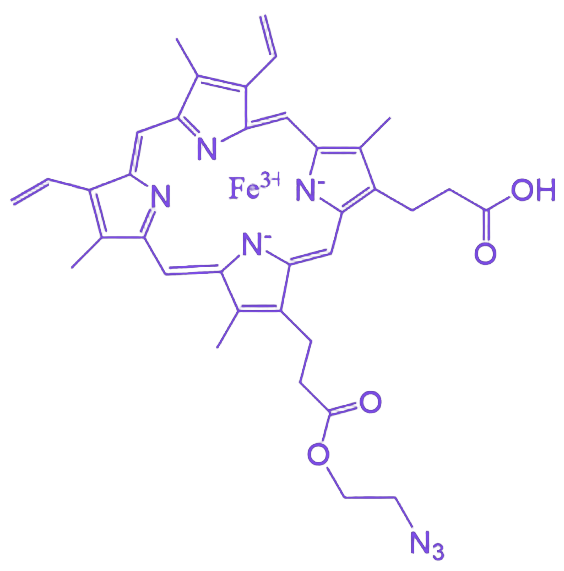 Hemin-N3 是通过对生物体内天然存在的含铁卟啉化合物——氯化血红素进行化学修饰,引入高反应活性的叠氮基团(-N₃)而得到的功能性衍生物。该化合物既保留了氯化血红素作为血红蛋白、肌红蛋白等关键蛋白核心辅基的生物活性,包括参与氧气运输、储存及酶促反应等重要生理过程,又通过叠氮基团的引入赋予其新的化学功能特性。 叠氮基团具有优异的反应活性,尤其能高效参与点击化学反应。点击化学以其反应高效性、高选择性及温和反应条件的显著优势,为 Hemin-N3 的功能化应用提供了重要途径。通过叠氮基团与含互补炔基的分子之间的特异性点击反应,Hemin-N3 可实现与其他功能分子的快速、精准连接,这一特性使其在构建复杂功能材料或生物共轭物领域具有重要应用潜力,为开发新型生物医用材料、靶向药物递送系统及生物传感器等提供了关键的分子设计工具。