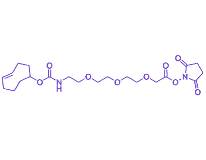 反式环辛烯(TCO)基团是该试剂的核心反应单元,可与四嗪(Tetrazine)类化合物发生快速、无催化剂参与的生物正交反应,这一特性使其特别适用于活体生物分子标记、细胞表面工程等对反应条件要求严苛的前沿研究场景,能够在复杂生物环境中实现高特异性的化学偶联。