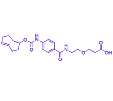 分子结构中的 反式环辛烯(TCO) 基团是实现生物正交反应的核心功能单元,能够与四嗪(Tetrazine)类化合物在生理条件下发生快速、无催化剂参与的 生物正交反应,该特性使其在活体成像、动态生物过程追踪等研究中具有显著优势。羰基氨基苯甲酰胺(carbonylamino-benzamido)结构单元作为分子的刚性连接骨架,通过羰基与氨基的化学特性,可在缩合试剂作用下与含氨基或羟基的生物分子形成稳定共价键,确保偶联产物的结构完整性。