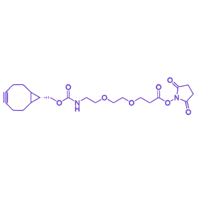 endo-BCN-PEG2-NHS 是一种含有 endo-双环[6.1.0]壬炔(BCN)结构和 NHS 酯官能团的高反应性环炔衍生物,其两个功能单元通过 二聚乙二醇(PEG₂)链连接。该化合物凭借 BCN 张力环炔与叠氮基团的 应变促进环加成反应(SPAAC)特性,可在无铜条件下实现生物体系中的高选择性、生物正交化学偶联,同时 PEG₂ 链提供适度柔性与亲水性,减少非特异吸附并在反应中形成空间位阻缓冲。 NHS 碳酸酯活性基团能够与目标分子的伯胺(–NH₂)基团快速反应,形成稳定的氨基甲酸酯或酰胺键,这一特性使其成为蛋白质、抗体、肽段、纳米颗粒、聚合物及表面材料生物正交修饰的多用途交联试剂。其操作条件温和,适用于中性 pH 环境下的偶联反应,可有效规避传统铜催化点击化学中金属离子对生物体系的潜在毒性。 PEG 间隔臂的引入显著提升了偶联物的水溶性与空间稳定性,同时保持 BCN 结构的高反应活性和 NHS 酯的快速反应动力学特性。与无 PEG 间隔的同类试剂相比,该化合物具有更优异的反应兼容性和生物相容性,在生物探针制备、纳米载体构筑、药物递送系统(如抗体-药物偶联物)及荧光标记体系中展现出广泛应用前景,是生物正交化学研究领域的高效连接单元。