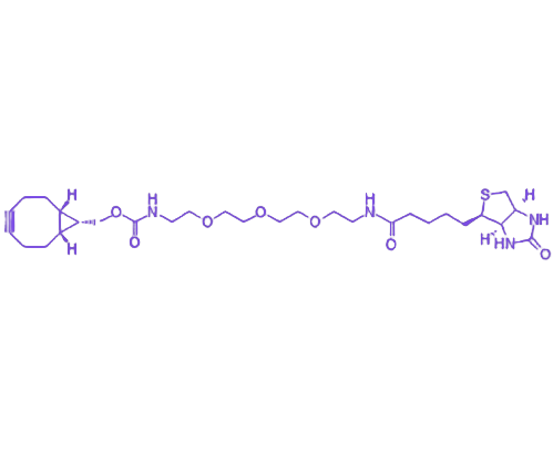 endo-BCN-PEG3-Biotin是一种整合内型环辛炔(endo-BCN)、三聚乙二醇(PEG3)连接臂和生物素三大功能单元的双功能试剂,其设计旨在为生物分子检测与分离提供高效解决方案。该试剂通过无铜点击化学与生物素-链霉亲和素系统的协同作用,在蛋白质组学、细胞生物学等领域展现出显著应用价值。 endo-BCN基团作为核心反应单元,可与叠氮标记的靶分子发生高效[3+2]环加成反应,此过程无需金属催化剂,有效避免了金属离子对活细胞等生物样本的潜在毒性,特别适用于活细胞标记等生理环境下的实验操作。另一端的生物素基团具备极高的分子识别能力,与链霉亲和素或亲和素蛋白形成的复合物解离常数可达10^15 M^-1级别,确保了目标分子捕获的特异性与稳定性。 位于两个功能基团之间的三聚乙二醇(PEG3)连接臂具有多重优势:其亲水性结构显著提升试剂在水溶液中的分散性,而适当的链长设计则为两端功能单元提供了充足的空间自由度,有效减少分子间的空间位阻效应,保障了点击化学反应与生物素结合过程的高效进行。 实际应用中,该试剂可通过两步法策略实现目标分子的精准操控:首先利用endo-BCN基团与叠氮标记的生物分子(如蛋白质、核酸或细胞表面标志物)特异性缀合,随后借助生物素-链霉亲和素的超高分选特性,实现对标记产物的高效检测或纯化。这一特性使其在蛋白质组学研究中的翻译后修饰分析、细胞表面受体动态追踪以及微量生物分子的高灵敏度检测等场景中成为关键工具。