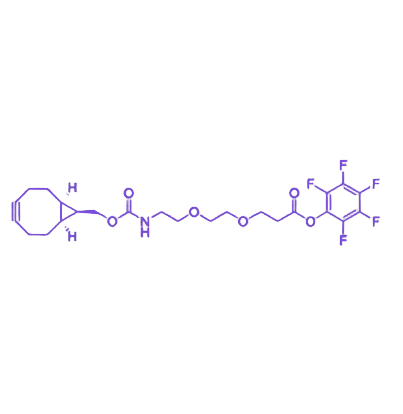 该化合物核心结构包含三个功能单元:BCN 基团通过 应变促进环加成(SPAAC)反应通道实现与叠氮(azide)基团的无金属催化“点击化学”反应,确保生物体系下的温和性与低毒性;PEG2 链段提供分子柔性与空间隔离效应,有效减少位阻干扰以提升反应效率和产物均一性;PFP 酯末端因高活性与适中稳定性,可快速与胺基分子发生偶联反应,实现蛋白质、抗体、小分子药物及多肽的精准修饰。