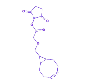 双功能结构设计体现为分子两端的精准适配,一端NHS活性酯可与含伯氨基生物分子(如蛋白质赖氨酸残基、多肽N端氨基)发生亲核取代反应,释放琥珀酰亚胺离去基团并形成稳定酰胺键,实现BCN基团的定向锚定;另一端BCN基团依托环张力驱动的应变促进炔-叠氮环加成反应(SPAAC),无需铜催化剂即可与叠氮标记分子efficient偶联,构建复杂功能体系,该反应特性可有效保留生物分子活性。