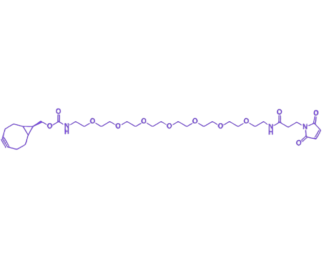 BCN-exo-PEG7-MAL是一种具备双功能特性的聚乙二醇交联剂,其分子结构设计支持在生物相容条件下实现多步偶联反应,适用于构建复杂生物偶联物。该交联剂通过两端不同的反应基团与间隔臂的协同作用,为生物分子的高效偶联提供了灵活解决方案。 分子一端的BCN-exo基团可通过无铜点击化学与叠氮基团发生环加成反应,此过程无需铜离子催化,能有效避免金属离子对活细胞或体内环境造成的潜在干扰,因此特别适用于活细胞标记或体内生物偶联场景。另一端的马来酰亚胺基团则可在生理pH条件下与巯基发生特异性反应,形成稳定的硫醚键连接,该反应具有高度的选择性和反应效率,能够实现靶向配体或功能分子的精准偶联。 连接两个反应位点的七聚乙二醇链段作为柔性间隔臂,不仅显著增强了分子的水溶性,还为连接的功能分子提供了较大的空间自由度。这种结构设计有助于减少因空间位阻导致的反应效率下降,同时降低偶联物之间的非特异性相互作用,提升生物偶联物的稳定性和生物活性。 在实际应用中,可利用其双官能团特性实现不同功能分子的顺序连接:例如,首先通过BCN-exo端与叠氮修饰的纳米载体或生物材料结合,随后通过马来酰亚胺端与含巯基的抗体、肽段或靶向配体连接,从而构建具有靶向递送、成像或治疗功能的生物偶联物。该交联剂的多功能性和生物相容性使其在药物递送系统、分子成像及生物分析等领域具有广泛的应用前景。