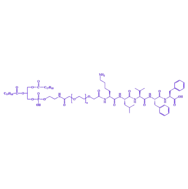 DSPE-PEG-KLVFF 是一种由磷脂、聚合物链与靶向肽段共价连接形成的功能性化合物,兼具脂质膜相互作用能力、水溶性调节特性及β-淀粉样蛋白(Aβ)靶向识别功能,在纳米药物递送系统构建中具有潜在应用价值。 DSPE(二硬脂酰磷脂酰乙醇胺)作为分子结构中的脂质单元,由两条硬脂酸脂肪酸链与磷脂酰乙醇胺头部基团通过酯键连接构成,凭借其强亲脂性可与生物膜、脂质体等脂质环境发生特异性相互作用,为化合物提供脂质双分子层插入能力,是构建纳米载体的基础骨架成分。 PEG(聚乙二醇)作为亲水修饰链段,通过共价键偶联于 DSPE 头部基团,其高水溶性和生物相容性可显著改善母体化合物的亲水性,同时通过空间位阻效应减少网状内皮系统清除,延长化合物在生物体内的循环时间,提升纳米递送系统的稳定性。 KLVFF 短肽序列作为靶向功能单元,由赖氨酸(K)、亮氨酸(L)、缬氨酸(V)、苯丙氨酸(F)、苯丙氨酸(F)按顺序通过肽键连接而成,其氨基酸序列与 Aβ 分子表面特定区域具有结构互补性,可通过特异性分子识别作用靶向结合 Aβ 聚集体,引导偶联的纳米载体向 Aβ 富集部位定向递送,为阿尔茨海默病(AD)的靶向治疗研究提供物质基础。