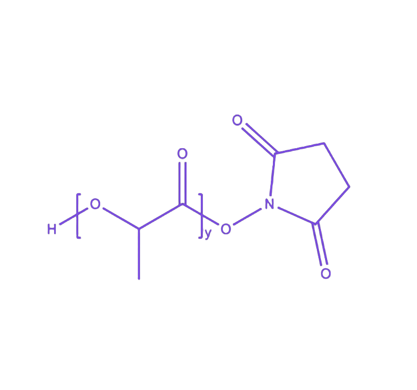 PLA-NHS是由聚乳酸链段与NHS酯官能团结合形成的功能性生物材料,其核心优势在于融合了聚乳酸的生物相容性、生物降解性与NHS酯的高反应活性,可作为生物分子偶联的高效载体。 聚乳酸作为生物基聚合物,来源于可再生资源,具备优异的生物降解性和生物相容性,这一特性使其在生物医学领域具有天然应用优势,能够减少植入或使用过程中的生物毒性风险。NHS酯官能团作为活性酯,可特异性与氨基(-NH₂)基团发生酰胺键偶联反应,该反应条件温和且产物稳定性高,确保PLA-NHS能高效连接含氨基的肽、蛋白质、小分子化合物等生物分子,形成结构稳定的偶联产物,适用于药物递送、生物成像、组织工程等领域的功能化修饰需求。