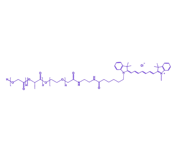 该材料的核心组分为 PLGA(聚乳酸-羟基乙酸共聚物),通过乳酸与羟基乙酸的共聚反应合成,具有优异的生物可降解性和生物相容性,可在生理环境中逐步降解为无害的小分子代谢产物,避免长期生物蓄积风险。分子结构中引入的 PEG(聚乙二醇)链段赋予材料良好的亲水性和空间位阻效应,能显著提升纳米颗粒的胶体稳定性,减少与血浆蛋白的非特异性吸附,延长体内循环时间。末端修饰的 CY7 荧光染料是近红外光区成像的关键功能单元,其光学特性表现为最大吸收波长740-770nm、最大发射波长780-800nm,该波段光穿透深度大、组织 autofluorescence 干扰低,特别适合深层组织的非侵入性荧光成像与示踪。