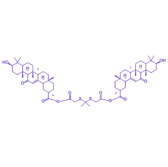 GA-TK-GA 是一种以天然产物甘草次酸(GA)为核心设计的二聚体化合物,通过酮缩硫醇(TK)键实现两个 GA 分子的连接。该设计整合了 GA 对肝细胞表面受体的天然靶向亲和力与 TK 键的环境响应性断裂特性,旨在提升药物递送的精准性与局部富集效率,同时降低全身毒副作用,并具备作为多功能模块拓展生物医学应用的潜力。 GA-TK-GA 的结构基础为两个 甘草次酸(GA) 分子,GA 作为甘草酸的活性代谢产物,不仅具有明确的药理活性,更因对肝细胞表面受体的天然亲和力而成为理想的靶向单元。连接两个 GA 分子的关键结构为 酮缩硫醇(TK)键,该键作为环境响应型连接子,可在酸性条件(如肿瘤微环境)或还原性环境中发生断裂,促使二聚体解聚为单体 GA,实现药物在靶部位的准确释放,从而增强局部药物浓度。 GA-TK-GA 的核心优势在于其双重功能整合:一方面利用 GA 的靶向性提高药物在肝脏或肿瘤组织的选择性富集,减少对正常组织的暴露;另一方面通过 TK 键的微环境响应断裂机制,确保药物在特定生理条件下高效释放,进一步提升治疗效果并降低全身毒性。此外,该二聚体结构可作为多功能模块,与脂质体、纳米颗粒等载体或其他治疗药物结合,构建智能响应型药物递送系统,为其在靶向治疗、药物控释等生物医学领域的应用提供了广阔空间。