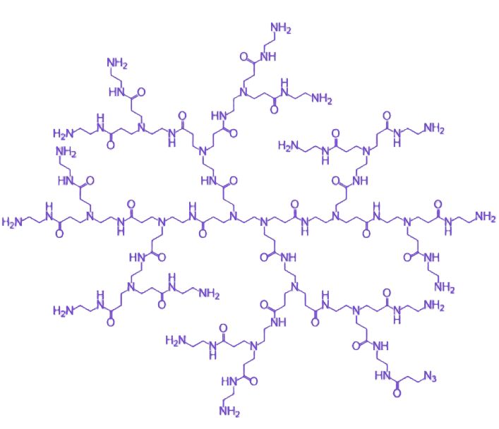 PAMAM-N3 是通过对聚酰胺-胺(PAMAM)树枝状聚合物进行化学修饰得到的功能化衍生物,其核心优势在于通过表面修饰引入的 叠氮基团(-N3) 显著提升了材料的反应活性与功能化灵活性。 PAMAM 树枝状聚合物本身具有高度支化的三维立体结构,这一结构特性赋予其较大的内部空腔和丰富的表面官能团,其中表面富含的 氨基(-NH2) 为后续化学修饰提供了充足的反应位点。通过特定化学反应在 PAMAM 表面成功引入叠氮基团后,材料可利用叠氮基团与炔基化合物发生 点击化学反应(环加成反应)的特性,便捷地与抗体、多肽等生物分子或荧光探针进行偶联,从而实现对材料的精准功能化修饰。