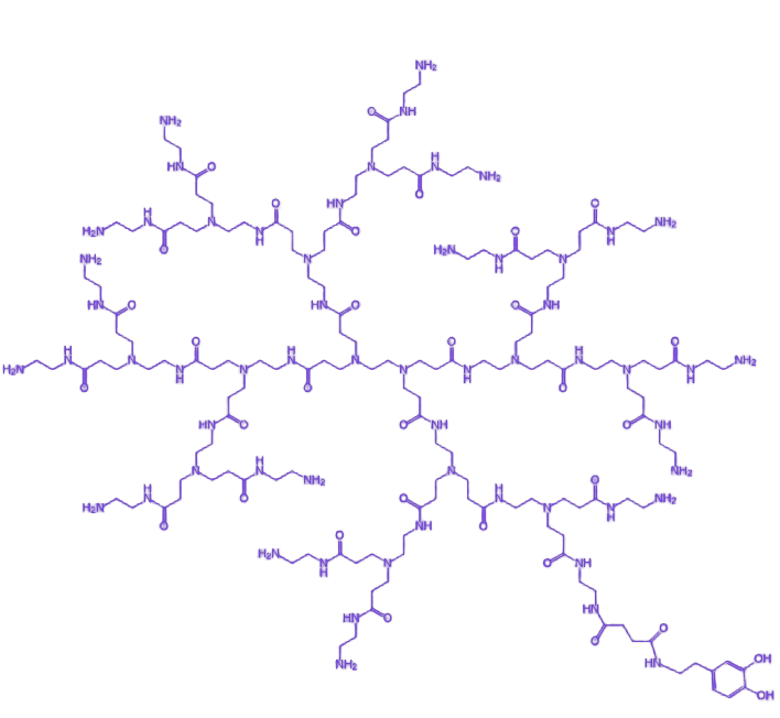 PAMAM 作为核心结构单元,以乙二胺为起始核心,通过逐层分支聚合形成高度支化的三维纳米结构,其表面分布有大量氨基、羟基或羧基等活性官能团,分子尺寸可通过调控代数(G0-G10)实现精准控制,内部空腔结构可高效包载药物分子或金属离子。多巴胺作为生物活性修饰单元,分子结构中含邻苯二酚与氨基官能团,赋予材料优异的表面粘附性能、生物相容性及抗氧化活性,可通过邻苯二酚基团与金属、聚合物等基材表面形成稳定的共价或非共价相互作用。
