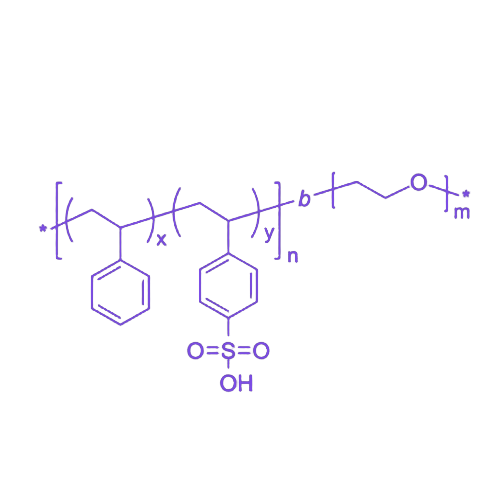 P(St-co-SSA)-b-PEO 是一种两嵌段共聚物,由苯乙烯(St)与磺基苯乙烯(SSA)随机共聚形成的疏水嵌段 P(St-co-SSA) 和亲水性的聚乙二醇(PEO)嵌段通过共价键连接构成。其核心特性源于两段的亲疏水平衡,可在水中自组装形成核-壳结构的胶束、聚集体或薄膜,是功能型水相离子聚合物材料的重要成员。