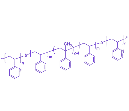 P2VP-b-PS-b-P2VP 是一种结构精准的 BAB 型三嵌段共聚物,其分子链由两侧的聚2-乙烯基吡啶(P2VP)链段与中间的聚苯乙烯(PS)链段通过共价键连接构成。该共聚物结合了 P2VP 的 pH 响应性、金属配位能力和极性相互作用,以及 PS 的刚性骨架、热稳定性和疏水性,形成兼具功能性与结构稳定性的智能高分子材料基材。