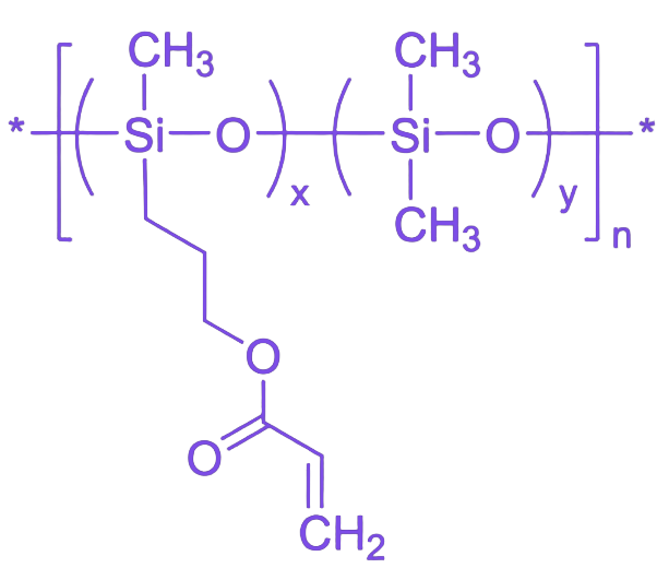 该共聚物的分子结构中,二甲基硅氧烷(DMS)链段为材料提供了有机硅的核心特性,包括低表面能、疏水性、良好的化学与热稳定性、优异的润滑性、高气体渗透性以及分子链固有的柔顺性。同时,无规嵌入的丙烯酰氧丙基甲基硅氧烷单元在惰性硅氧烷主链上引入了高反应活性的功能位点,其末端的丙烯酰氧基团可在光引发剂存在下,通过紫外光(UV)照射引发快速自由基聚合反应,实现高效的光固化交联,这种“被动属性”与“主动交联”的结合是材料的关键优势。