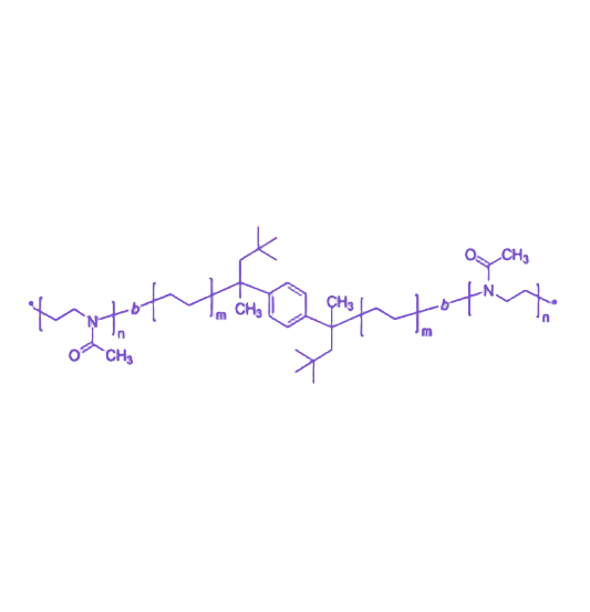 PMeOx-PE-PMeOx 是一种由亲水性 聚 2-甲基-2-氧唑啉(PMeOx) 链段与疏水性 聚乙烯(PE) 链段通过 ABA 型三嵌段结构共价连接形成的两亲性共聚物。该材料结合了 PMeOx 的高水溶性、类 PEG 特性及生物相容性,与 PE 链段的柔性、半结晶性和机械增强作用,通过分子自组装可形成胶束、囊泡或多层薄膜等纳米结构,在界面工程、功能涂层及纳米材料稳定等领域具有广泛应用前景。