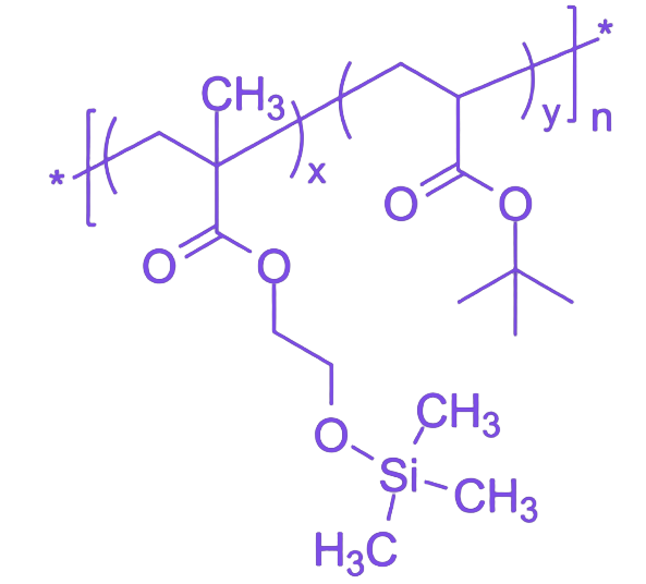 Poly(trimethylsiloxy-2-ethyl methacrylate-co-tert-butyl acrylate) 无规共聚物是一种通过含硅甲基丙烯酸酯与含叔丁酯丙烯酸酯单体无规共聚形成的特种丙烯酸酯聚合物,其分子结构设计实现了有机硅表面性能与可反应性基团的协同整合,通过调控两种单体比例可精准定制材料从疏水性到亲水性的转变。