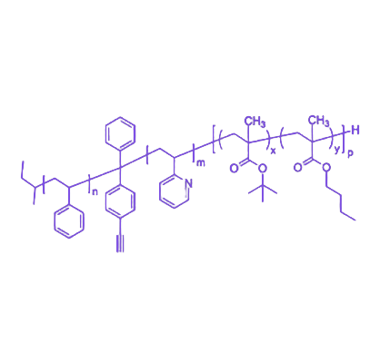 该Poly(styrene)-b-poly(2-vinyl pyridine)-b-poly(tert-butyl methacrylate–co–n-butyl methacrylate)是一种通过分子工程设计的三嵌段共聚物,其核心特征在于PS与P2VP嵌段间引入的4-乙炔苯基连接单元,实现了结构控制、刺激响应与点击化学功能的一体化集成,为表面科学、纳米技术及催化领域提供了功能可调的先进高分子材料解决方案。