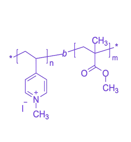 QP4VP-b-PMMA 是由 季铵化4-乙烯基吡啶(QP4VP)与 聚甲基丙烯酸甲酯(PMMA)构成的两嵌段共聚物,融合强离子性与玻璃态有机聚合物特性,通过“刚性-离子性”组合实现溶液、界面及固态中的自组装,形成核-壳胶束、离子簇网络、定向纳米通道等离子相分离结构,在膜材料、界面改性、纳米功能组装等领域具有重要应用前景。