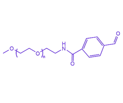 mPEG-Benzaldehyde作为聚乙二醇衍生物家族的重要成员,通过聚乙二醇单甲醚(mPEG)末端羟基与苯甲醛的化学偶联制备而成,兼具PEG链的亲水性与生物相容性,以及苯甲醛基团引入的活性醛基功能,在生物偶联、材料改性等领域具有广泛应用潜力。 PEG链段赋予该化合物优异的亲水性和生物相容性,同时调控其流变学特性,确保在水相体系中的良好分散性;苯甲醛基团提供的醛基具有高化学反应活性,可与含氨基、羟基等亲核基团的化合物发生特异性反应,例如与伯胺基在温和条件下通过席夫碱反应形成亚胺键,实现生物分子偶联或交联结构构建。 苯环结构的引入为分子提供一定刚性,有助于稳定空间构象,同时其疏水性可调节分子与界面的相互作用,在药物载体设计中可优化包埋效率与释放行为。产品提供多种聚合度选择,不同分子量对应不同分子尺寸,短链产品适用于快速扩散和高反应活性需求场景,长链产品则更利于构建长效稳定载体系统,满足多样化研究与应用需求。