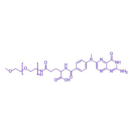 mPEG-Folate(甲氧基聚乙二醇叶酸)是通过共价键将甲氧基聚乙二醇(mPEG)与叶酸(Folate)连接形成的靶向性生物材料,其核心优势在于融合了mPEG的亲水性、生物相容性及长循环特性,与叶酸对叶酸受体(FR)高表达细胞的特异性识别能力,可作为靶向配体广泛应用于生物医学领域。 mPEG链段通过空间位阻效应减少材料的免疫原性,同时延长其在体内的循环时间,为药物递送提供更持久的作用窗口;叶酸基团则凭借与FR的高亲和力,通过受体介导的内吞作用实现对靶细胞的主动靶向,显著提升靶向效率。 该材料主要修饰于纳米药物载体、荧光探针或生物材料表面,在肿瘤靶向治疗、分子影像及生物医学研究中发挥关键作用,能够有效提高药物递送效率、降低系统毒性,并为疾病的准确诊断与治疗提供高效工具。