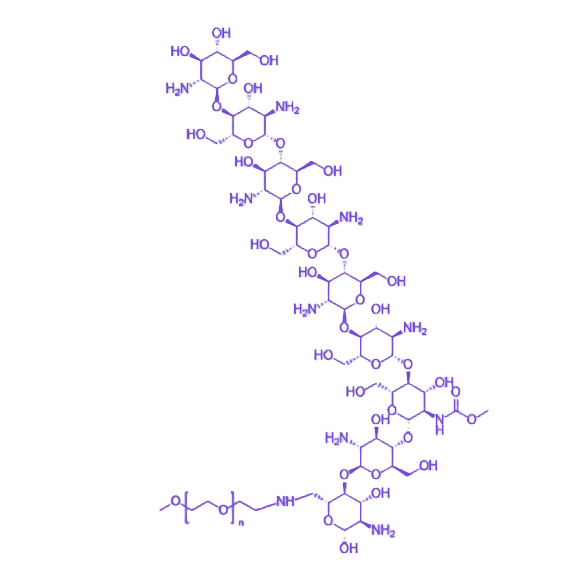 mPEG-g-CS 是通过化学接枝反应将单甲氧基聚乙二醇(mPEG)链共价连接到壳聚糖(CS)分子链而形成的两亲性共聚物,该材料集成了 mPEG 的亲水性与壳聚糖的生物活性,具备独特的分子结构与多功能特性。 mPEG 作为亲水性聚合物链段,具有优异的水溶性、生物相容性及分子柔顺性,其引入可赋予共聚物良好的水合能力和空间位阻效应,有效改善材料的界面特性。壳聚糖作为天然氨基多糖,由氨基葡萄糖与 N-乙酰氨基葡萄糖通过 β-1,4-糖苷键连接而成,分子链中富含氨基(-NH₂)和羟基(-OH)等活性基团,赋予材料生物可降解性、阳离子表面特性及生物黏附能力。 在 mPEG-g-CS 共聚物结构中,mPEG 链通过化学键接枝于壳聚糖主链,形成具有核-壳结构特征的高分子体系。这种结构设计不仅保留了壳聚糖的生物相容性和反应活性,还通过 mPEG 链的空间屏障作用减少蛋白质吸附和细胞识别,在生物医用领域展现出潜在应用价值,如药物递送载体、生物涂层材料及组织工程支架等方向。