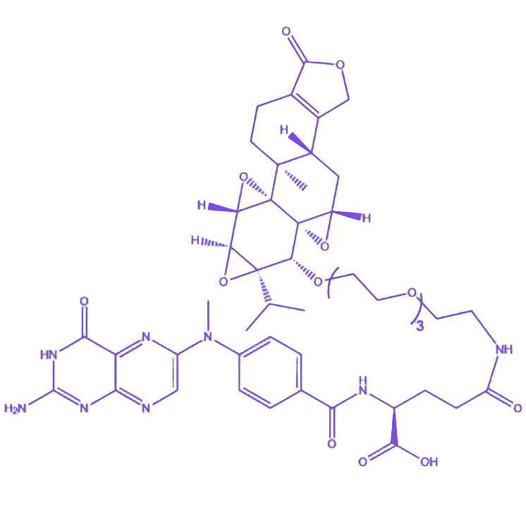 Triptonide-PEG3-FA 是通过化学合成构建的靶向药物递送系统,由 雷公藤内酯酮(Triptonide)、三聚乙二醇(PEG3)和 叶酸(Folic Acid)共价连接而成。该结合物整合了活性成分的药理作用、连接臂的理化特性优化及靶向配体的主动递送功能,为肿瘤治疗研究提供了具有潜在应用价值的新型工具分子。 雷公藤内酯酮作为天然来源的生物活性成分,具备 免疫调节和 抗肿瘤等多种药理学潜力,是该结合物发挥治疗作用的核心单元。三聚乙二醇连接臂通过其亲水性特性显著改善雷公藤内酯酮的水溶性,同时凭借分子柔性和空间位阻效应提升结合物在体内的 稳定性和 药代动力学特性,减少非特异性分布。叶酸配体可特异性识别并结合肿瘤细胞表面高表达的 叶酸受体,通过受体介导的内吞作用实现药物向肿瘤组织的靶向递送,从而提高局部药物浓度并降低对正常组织的毒副作用。三者的协同作用使 Triptonide-PEG3-FA 在保持雷公藤内酯酮生物活性的基础上,实现了靶向性与药物理化性质的双重优化,为相关疾病的精准治疗研究奠定了物质基础。