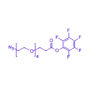 该化合物的核心结构包含-N₃(叠氮基),作为点击化学的关键反应基团,可通过铜催化或无铜环加成与炔烃、环辛炔等快速形成稳定共价键,反应条件温和且选择性高,有效避免生物分子活性损失。PEG6 链段(-(OCH₂CH₂)₆-)赋予分子优异的水溶性和生物相容性,同时通过柔性链结构减少空间位阻,显著提升修饰效率。末端五氟苯基(PFP)作为强吸电子离去基团,可在温和条件下与胺、醇等亲核试剂反应,高效生成稳定的酰胺键或酯键,适用于蛋白质、抗体及表面配体的定点修饰。