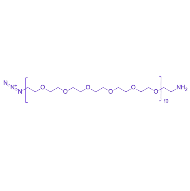 N3-PEG600-NH2是一种具有双功能结构的聚乙二醇衍生物,由叠氮基团、聚乙二醇链段和氨基基团组成,具备高效的化学修饰能力与良好的生物相容性,适用于生物偶联、材料表面改性等领域。 该化合物一端为叠氮基团(-N₃),化学活性突出,可在铜催化条件下与炔基发生点击化学反应,特异性生成稳定的1,2,3-三唑环;也可在无铜体系中与DBCO等炔基衍生物反应,避免金属催化剂对生物体系的潜在干扰。另一端为氨基(-NH₂),能在温和条件下与羧酸、活性酯等含羰基化合物发生缩合反应,形成稳定的酰胺键,实现分子间的高效偶联。 中间链段为分子量约600的聚乙二醇,赋予分子优异的水溶性、柔韧性及生物相容性,可有效降低非特异性吸附,提升修饰后体系的稳定性与分散性。产品外观通常为白色至类白色固体粉末或粘稠液体,储存过程中需保持干燥环境,以确保化学稳定性。
