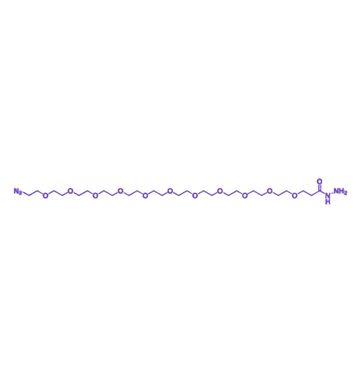 N3-PEG11-HZ是一种双端功能化线性聚乙二醇衍生物,一端为叠氮基(–N₃),另一端为酰肼基(–HZ),中间含约11个乙二醇重复单元(n≈11)。该化合物分子量适中、极性良好,兼具高生物相容性与双端化学反应活性,是连接化学与生物体系的重要桥梁分子,广泛应用于生物偶联体系构建和智能响应材料研发。