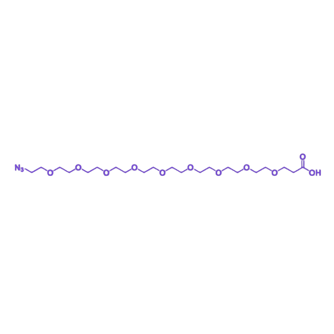 N3-PEG9-Acid 是一种双端功能化聚乙二醇衍生物,分子两端分别携带叠氮基(–N3)与羧酸基(–COOH),中间通过九单元 PEG 链(PEG9)连接形成柔性间隔结构。该化合物凭借其独特的分子设计,在生物偶联、材料功能化及生物医学成像等领域展现出显著应用价值,尤其适用于需要优化空间位阻和提升水溶性的复杂体系。 分子结构与特性:核心结构由叠氮端、PEG9 链段和羧酸端三部分构成。PEG9 链较 PEG5–PEG8 具有更长的碳链,提供更高的空间伸展性和柔性,能有效降低生物大分子或纳米材料偶联过程中的空间位阻,同时保持分子整体的结构稳定性和紧凑性。PEG 链段的引入显著提升了分子的水溶性和分散性,有助于维持偶联体系的生物活性及结构完整性,其链长度可根据实验需求在 PEG1 至 PEG24 范围内定制,以满足不同空间调节、溶解性及体内循环时间的要求。 化学偶联机制:叠氮端可与炔基化小分子、药物、荧光团、肽链或纳米材料通过 点击化学(Click Chemistry)实现高效偶联,兼容铜催化的 CuAAC 和无铜的 SPAAC 点击体系。该反应具有高度专一性,生成化学稳定性和生物惰性良好的 1,2,3-三氮唑键,适用于生物分子标记、药物偶联及成像探针构建。羧酸端则可通过 EDC/NHS 等活化试剂与氨基类分子形成酰胺键,实现目标分子或载体的固定化,尤其适用于蛋白质、抗体、肽、多糖及纳米材料等大分子体系的偶联需求。 应用领域:在 抗体药物偶联(ADC) 中,PEG9 链提供的合理空间间距可避免抗体与药物分子间的相互干扰,增强偶联物的稳定性;在纳米药物载体表面改性中,其柔性链段能提升载体的生物相容性和循环性能;在活细胞及体内成像探针构建中,点击化学的高效性和低毒性可实现对生物靶点的精准标记与示踪。此外,该衍生物还可用于生物分子功能化修饰、纳米材料表面工程及复杂生物体系的偶联反应优化。