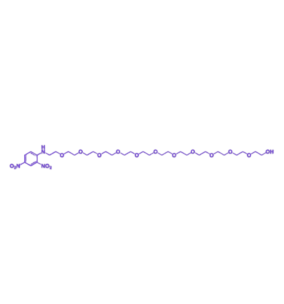 DNP-PEG12-OH 是一种功能化分子构建单元,其结构由末端含 dinitrophenyl(DNP)芳香基团、主链为 十二单元聚乙二醇(PEG12) 以及另一端的 羟基(–OH) 组成。该分子结合了 DNP 基团的高反应活性与 PEG12 链段的亲水性和生物相容性,适用于生物分子修饰、免疫分析及药物递送等领域,末端羟基可进一步衍生化以拓展功能。 DNP 基团具有较强的电子吸拉能力,赋予分子在光化学、受体识别及免疫化学领域中高度可控的反应性。PEG12 片段作为柔性亲水性间隔臂,提供约 48–50 Å 的长度,使 DNP 基团能在水相环境中以适当距离暴露,降低空间位阻并提高与靶分子的结合效率。同时,PEG12 链段赋予分子高溶解度、低非特异吸附和优越的生物相容性,有助于构建高稳定性的生物分子修饰体系。 核心用途包括构建抗 DNP 抗体识别模块、制备免疫分析探针、修饰蛋白质与纳米材料以提升靶向性,以及作为亲水间隔臂用于药物递送体系或生物界面调控。由于 PEG12 提供的适宜柔性链段长度,该分子在纳米颗粒表面修饰时可有效延伸并呈现 DNP 基团,在 ELISA、FRET 探针、免疫复合物调控和纳米平台可视化标记等应用中展现性能优势。 化学稳定性方面,DNP-PEG12-OH 在常规温和条件下不易分解,PEG 主链可在多种极性或弱极性溶剂中良好溶解,如 DMSO、DMF、甲醇、乙腈与 PBS(根据 pH/比例调节)。分子结构适合与金纳米颗粒、磁性纳米颗粒、聚合物微球、脂质体及蛋白质平台进行表面接枝,可通过氯化物活化、碳二亚胺耦联、环氧化衍生化等方式修饰 –OH 末端实现二次功能化。其良好的生物相容性使其可应用于免疫纳米探针、可控组装材料、诊断试剂开发及多价抗原构建。