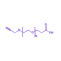 PEG7链段作为连接炔基与羧基的亲水性间隔臂,兼具亲水性与空间调控优势。一方面可显著提升分子的水溶性与生物相容性,减少与血清蛋白、细胞等生物基质的非特异性吸附,降低免疫原性;另一方面,7个乙二醇单元构成的中等链长能提供适宜的空间柔性,避免炔基与羧基在偶联过程中产生空间位阻,保障偶联后生物分子的天然活性构象不受影响。