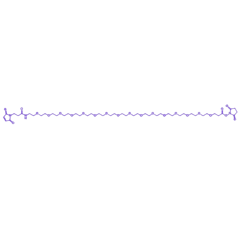 Mal-PEG16-NHS是一种双功能聚乙二醇衍生物,通过马来酰亚胺(Mal)基团与巯基(-SH)的特异性反应、N-羟基琥珀酰亚胺(NHS)酯与伯胺基团的高效偶联,以及PEG16长链赋予的优异水溶性和生物相容性,在生物医学研究与药物开发领域具有关键应用价值。 其分子结构两端分别修饰功能性基团:马来酰亚胺(Mal)基团在pH 6.5-7.5条件下,可与生物分子中的巯基(-SH)发生特异性快速反应,生成稳定的硫醚键,实现精准共价修饰;N-羟基琥珀酰亚胺(NHS)酯则在pH 7-8.5环境中,与伯胺基团高效缩合形成稳定酰胺键,拓展生物分子偶联的多样性。中间连接的PEG16长链不仅显著提升分子水溶性,还能有效降低生物体系中的非特异性吸附,减少免疫原性,增强修饰后分子的生物相容性与体内循环稳定性。 该特性使其广泛适用于抗体-药物偶联物(ADC)的定点偶联制备,通过控制药物与抗体的结合比例提升治疗靶向性;在蛋白质及多肽的位点特异性修饰中,可实现活性基团的精准引入以调控生物功能;同时,在纳米材料表面功能化修饰领域,能赋予载体材料良好的生物兼容性,推动纳米药物递送系统的研发与应用。