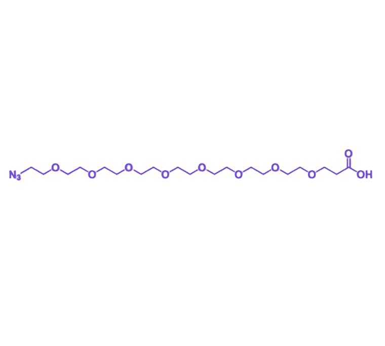 N3-PEG8-Acid 是一种双端功能化聚乙二醇衍生物,分子结构由 叠氮基(–N3)、羧酸基(–COOH)及 八单元 PEG 链(PEG8)构成,两端基团通过柔性间隔臂实现高效偶联功能,适用于生物分子标记、药物递送及材料功能化等场景。 该化合物分子两端分别修饰 叠氮基 与 羧酸基,中间通过 PEG8 链段连接。PEG8 作为柔性间隔臂,相比短链 PEG(如 PEG5-PEG7)具有更优的空间伸展性,能有效降低生物大分子或纳米体系偶联过程中的 空间位阻,提升反应效率并维持目标分子生物活性。同时,PEG8 链段可增强分子水溶性与分散性,优化偶联体系的结构稳定性及体内循环特性。 叠氮端可通过 点击化学(Click Chemistry)与炔基化小分子、荧光探针、药物分子或纳米材料高效偶联,兼容铜催化 CuAAC 及无铜 SPAAC 反应体系。点击反应具有高度专一性,生成稳定的 1,2,3-三氮唑键,该键具备良好化学稳定性与生物惰性,适用于活细胞成像、靶向药物构建等精密场景。羧酸端可经 EDC/NHS 等活化试剂处理,与氨基化合物形成稳定酰胺键,实现蛋白质、抗体、肽链等生物分子的固定化或表面修饰。 该衍生物可根据应用需求定制 PEG 链长度(范围 PEG1-PEG24),通过调节链段长度优化空间位阻效应、水溶性及体内循环时间。产品提供多纯度等级选择,并支持批量合成与偶联工艺优化,满足科研实验及工业生产对高纯度、高稳定性功能材料的需求。