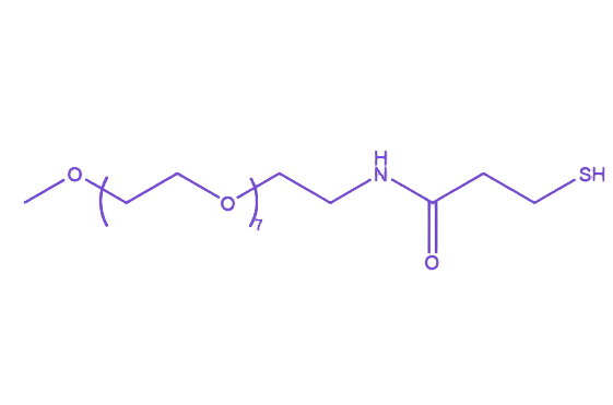 mPEG350-SH是一种线性单官能团聚乙二醇衍生物,其分子结构一端为甲氧基(-OCH₃),另一端为具有反应活性的巯基(-SH),聚乙二醇链段平均分子量约为350。该化合物兼具聚乙二醇的亲水性与生物相容性,以及巯基的高反应活性,在生物医学及材料表面修饰领域具有广泛应用潜力。 聚乙二醇(PEG)链段赋予该衍生物良好的亲水性和生物相容性,在溶液中可形成水化层,能有效降低修饰后物质的表面自由能,减少非特异性吸附,这一特性使其适用于对生物相容性要求较高的应用场景。巯基作为关键功能基团,化学性质活泼,可在pH 6.5-7.5条件下与马来酰亚胺选择性反应生成稳定的巯醚键,也能与金、银等金属表面形成强相互作用,常用于金属纳米粒子或金属膜的表面功能化修饰。 值得注意的是,mPEG350-SH中的巯基易在空气中发生氧化,两个巯基之间会形成二硫键(-S-S-),但这种二硫键在还原性试剂如三(2-羧乙基)膦盐酸盐(TCEP)或谷胱甘肽存在下可发生还原反应断裂,重新恢复为巯基。这种可逆的氧化还原特性使得该衍生物在需要动态调控连接强度或实现可逆修饰的聚乙二醇化应用中具有独特优势,例如在药物控释系统、生物传感器及靶向递送载体的构建中发挥重要作用。