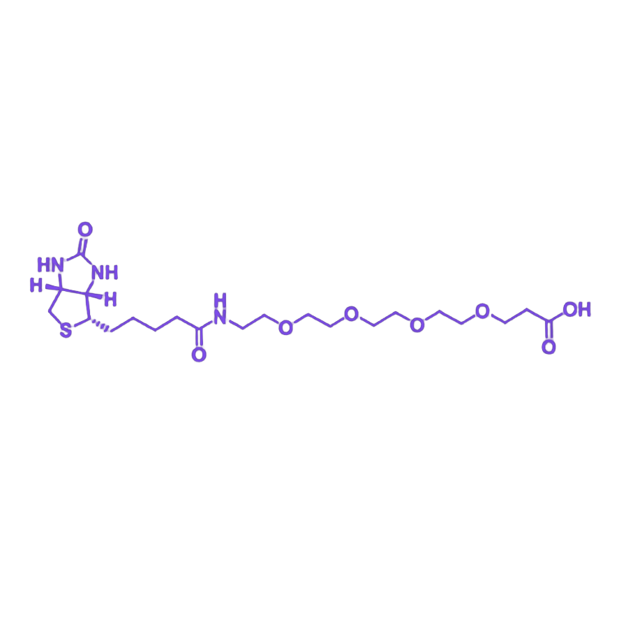 Biotin-PEG4-COOH(生物素-聚乙二醇-羧基)是一种兼具高特异性识别与多功能修饰能力的功能化聚乙二醇衍生物,其分子结构由生物素基团、四聚乙二醇(PEG4)连接臂及末端羧基(COOH)构成,广泛应用于生物分子标记、纳米载药系统构建及生物传感界面修饰等前沿生物技术领域。 该化合物的核心功能单元包含三部分:生物素基团作为特异性识别模块,可与亲和素/链霉亲和素发生高效、专一的非共价相互作用(解离常数Kd≈10⁻¹⁵ M),为生物分子的靶向捕获与可视化检测提供分子基础;四聚乙二醇链段作为柔性连接桥,凭借其优异的水溶性、生物相容性及空间位阻效应,能有效降低修饰后复合物的免疫原性与非特异性吸附,提升分子在生理环境中的稳定性;末端羧基则作为化学反应活性位点,可在活化剂(如EDC/NHS)介导下与伯胺(-NH₂)、羟基(-OH)等官能团发生酰胺化或酯化反应,实现对抗体、多肽、药物分子及纳米材料的精准偶联。 在应用场景中,Biotin-PEG4-COOH通过羧基与目标分子共价结合后,其生物素基团可与标记有荧光、酶或磁性颗粒的亲和素探针特异性结合,构建“捕获-检测”双功能平台。该特性使其在蛋白质组学分析(如Western Blot、免疫共沉淀)、靶向药物递送(如脂质体表面生物素化修饰)及诊断试剂盒开发(如侧向流免疫层析)中展现出显著优势。此外,PEG4链的适度长度(分子量约387 Da)可平衡分子柔性与空间位阻,避免对生物分子活性构象的干扰,是兼顾修饰效率与生物相容性的理想选择。