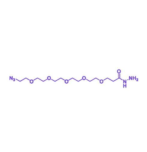 化学结构由叠氮基(–N₃)、三单元乙二醇链段及酰肼基(–CONHNH₂)构成,分子式表示为N₃–(CH₂CH₂O)₃–CONHNH₂。PEG5链段长度介于短链与中链之间,提供适中的柔性与疏水/亲水平衡,确保在生物体系中的良好分散性与生物相容性。叠氮端可与含炔基化合物发生高选择性、高产率的Cu(I)-催化1,3-偶极环加成反应,形成稳定的1,2,3-三唑结构,该反应在温和条件下进行,是生物分子标记与功能材料构建的核心方法。酰肼端能与醛基或酮基通过缩合反应形成腙键(C=N–NH–),此键具有酸敏感性,在酸性环境中可发生水解断裂,从而实现药物的pH响应性释放或动态交联网络的可逆调控。